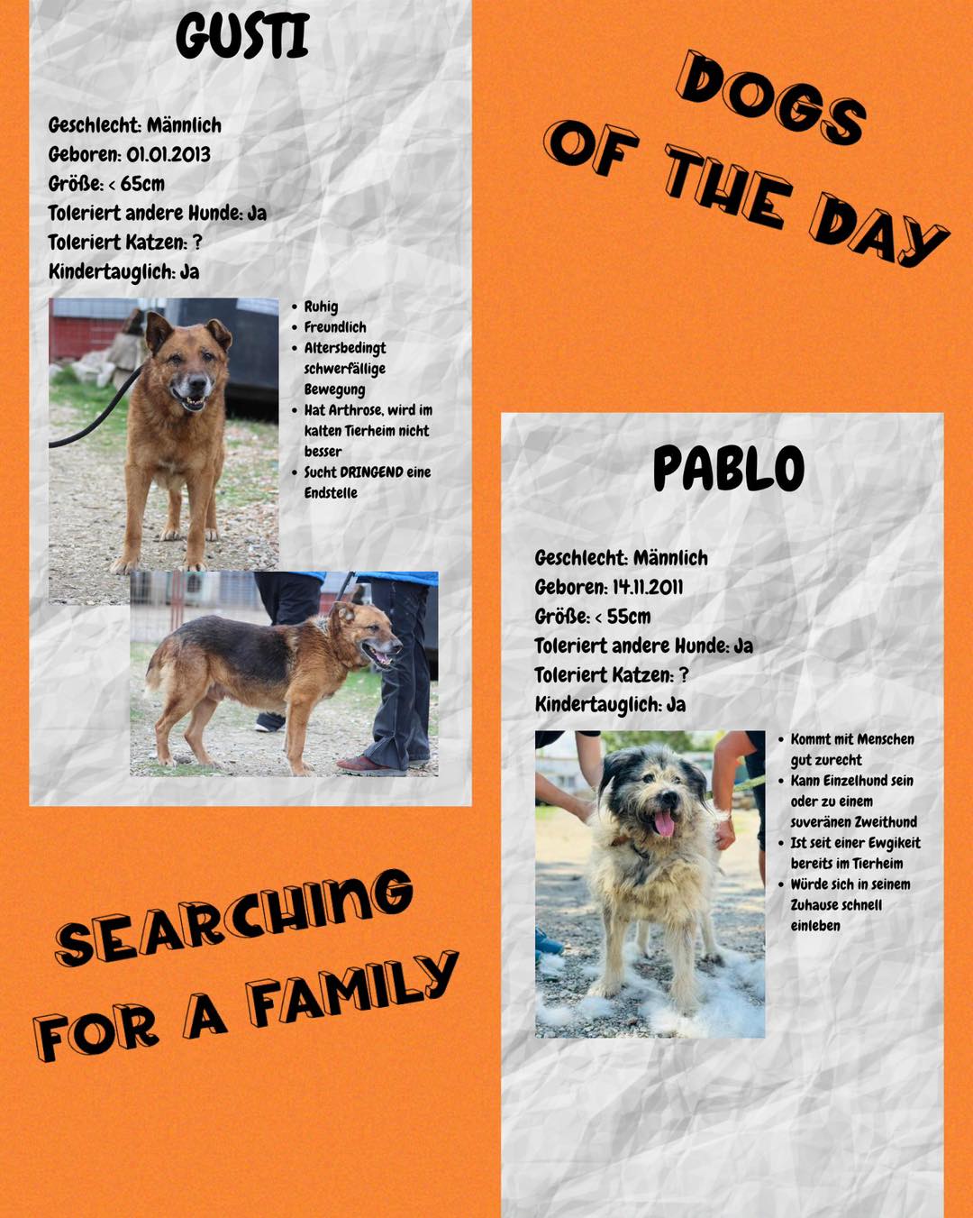 Wir sind sehr dankbar, dass unter den 81 Tieren auch alte und behinderte Hunde adoptiert wurden. Auch diese Sehlen haben ein gutes Zuhause verdient. Dabei denken wir an: