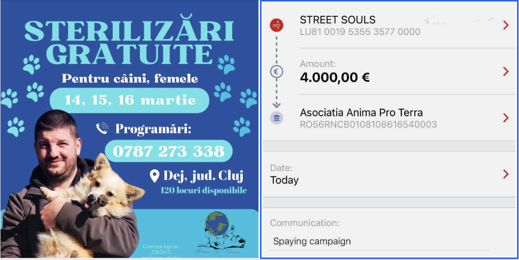 Ganze 14.000€ sind an ASOCIATIA Anima Pro Terra überwiesen worden, für Kastrationen und Tierarztkosten!